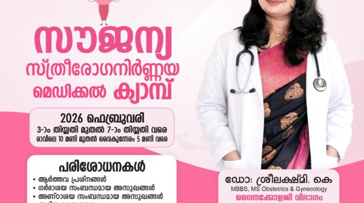 2026 ഫെബ്രുവരി 3-ാം തിയ്യതി മുതൽ 7-ാം തിയ്യതി വരെ രാവിലെ 10 മണി മുതൽ വൈകുന്നേരം 5 മണി വരെ പരിശോധനകൾ ♦️ ആർത്തവ പ്രശ്നങ്ങൾ ♦️ ഗർഭാശയ സംബന്ധമായ അസുഖങ്ങൾ