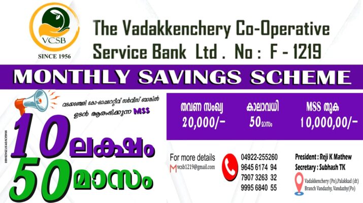 വടക്കഞ്ചേരി കോ-ഓപ്പറേറ്റീവ് സർവീസ് ബാങ്കിൽ ഉടൻ ആരംഭിക്കുന്ന MSS 𝟏𝟎 ലക്ഷം.𝟓𝟎 മാസം