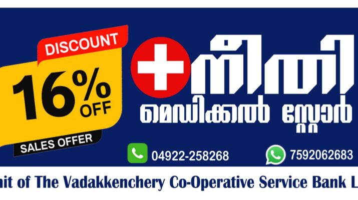 വടക്കഞ്ചേരി കോ-ഓപ്പറേറ്റീവ് സര്വ്വീസ് ബാങ്കിന്റെ സ്ഥാപനമായ നീതി മെഡിക്കല് സ്റ്റോറില് എല്ലാവിധ ഇംഗ്ലീഷ് മരുന്നുകളും 16% ഡിസ്കൗണ്ടില് നല്കിവരുന്നു.കൂടാതെ വളർത്തു മൃഗങ്ങൾക്കുള്ള മരുന്നുകളും ഇവിടെ ലഭ്യമാണ്. മരുന്നുകൾ വീടുകളിൽ എത്തിച്ചു കൊടുക്കുന്നു (നിബന്ധനകൾക്ക്